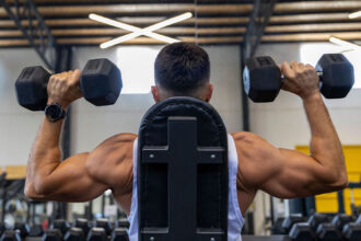 The setup for the seated dumbbell overhead press looks simple: You grab the weights, sit…